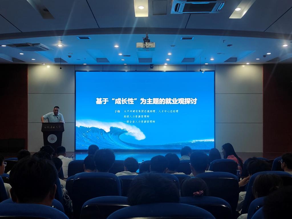 5月23日下午,52书库 邀请太平洋建设集团总裁助理、人才中心总经理于伟于图书馆第一报告厅开展《基于“成长性”为主题的就业观探讨》专题讲座。太平洋建设集团总裁助理、人才中心总经理于伟一行人员、52书库 党委书记张虎、师生代表参加讲座。讲座由张虎主持。