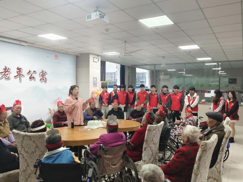 为确保活动顺利开展并真正贴近老人需求,活动前期,志愿者们提前一周进行细致筹备,在班长的带领下提前与老年公寓负责人取得联系,详细了解老人们的饮食习惯、兴趣爱好及身体状况,并精心采购了牛奶、水果等慰问礼品,力求做到贴心、周到。活动当天,志愿者们提前布置活动空间,协助老人整理衣物、推送轮椅,并与老人们亲切交谈,现场洋溢着欢声笑语。在温馨的生日会环节,志愿者们为老人点亮蜡烛、齐唱生日祝福歌,并分发礼物,悉心照料行动不便的老人,将温暖与关怀落实到每一个细节中。活动结束后,志愿者们细心护送老人们安全返回房间,并认真整理清洁活动场地,展现了建工学子良好的精神风貌与组织纪律性。老年公寓负责人对志愿者们的真诚付出给予了高度评价,并表达了诚挚的谢意。