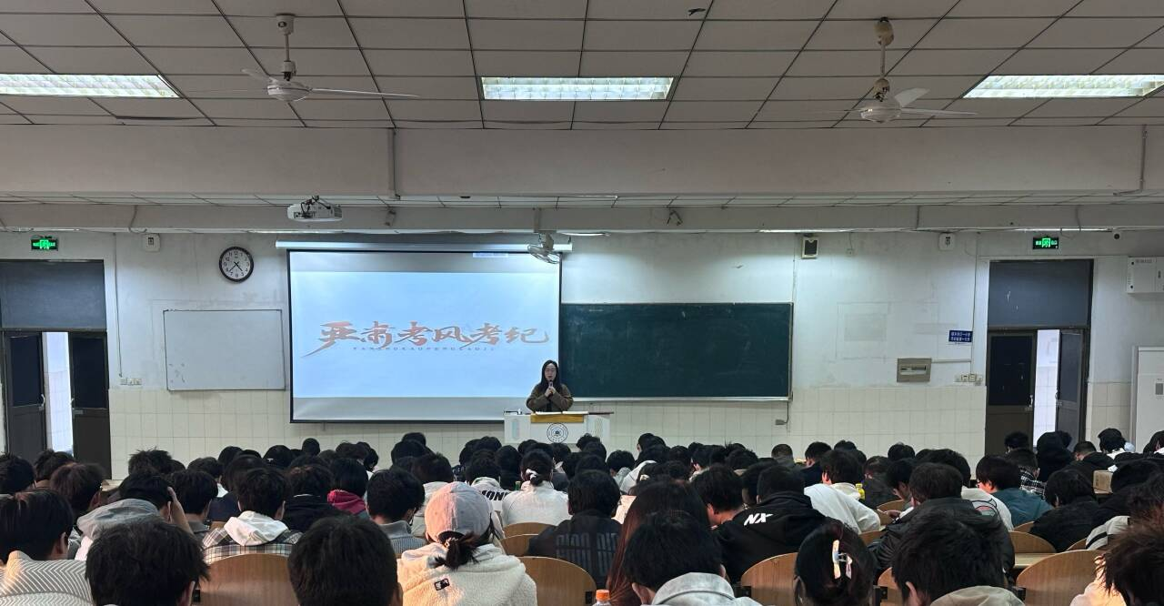 学生违纪处分规定》等各项考试规章制度的规定,提醒同学们要严守底线,诚信应考;结合校内外近年来发生的典型考试违纪案例,警示同学们务必端正考风、严守考纪。针对复习备考提出了三点建议:一是注重劳逸结合,每天坚持体育锻炼,保持良好身心状态;二是科学规划学习时间,提高学习效率;三是调整考试心态,以良好状态迎接考试。同学们相互督促、共同进步,在备考过程中深化对专业知识的理解,实现个人能力的全面提升。