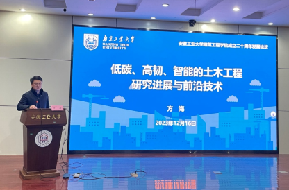 国家高层次青年人才、江苏省杰青、南京工业大学土木工程学院院长方海教授作了题为《低碳、高韧、智能的土木工程研究进展与前沿技术》的报告,介绍了南京工业大学土木工程学院在绿色材料与低碳结构、复合材料结构、智慧建造与智慧运维、城市韧性与防灾安全等方面取得的相关科研成果,提出“土木+力学”、“土木+智能”、“土木+安全”、“土木+材料”的学科融合发展方向。